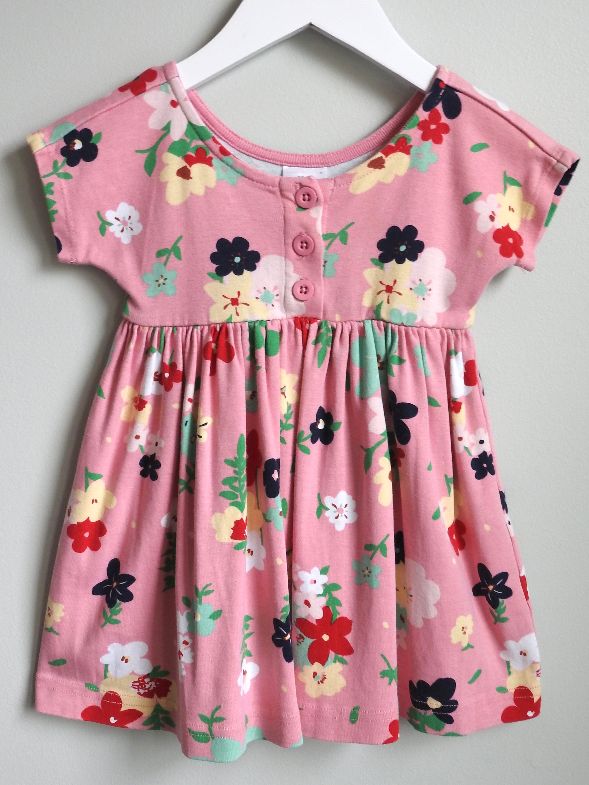 - Pink dress printed with multicolored flowers (yellow, blue, red, green)