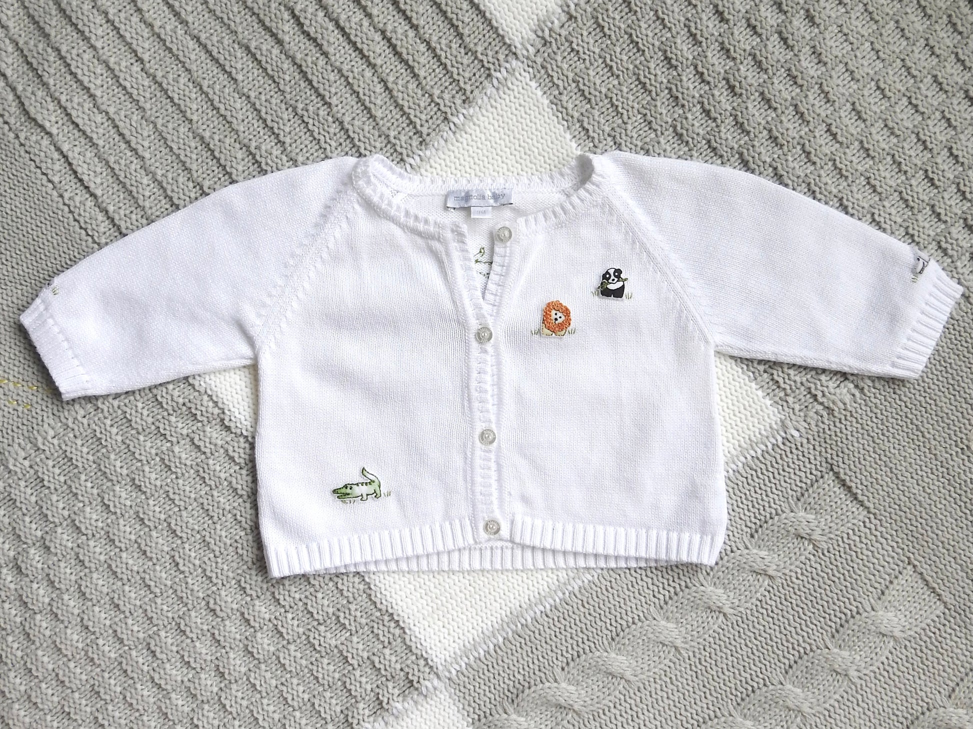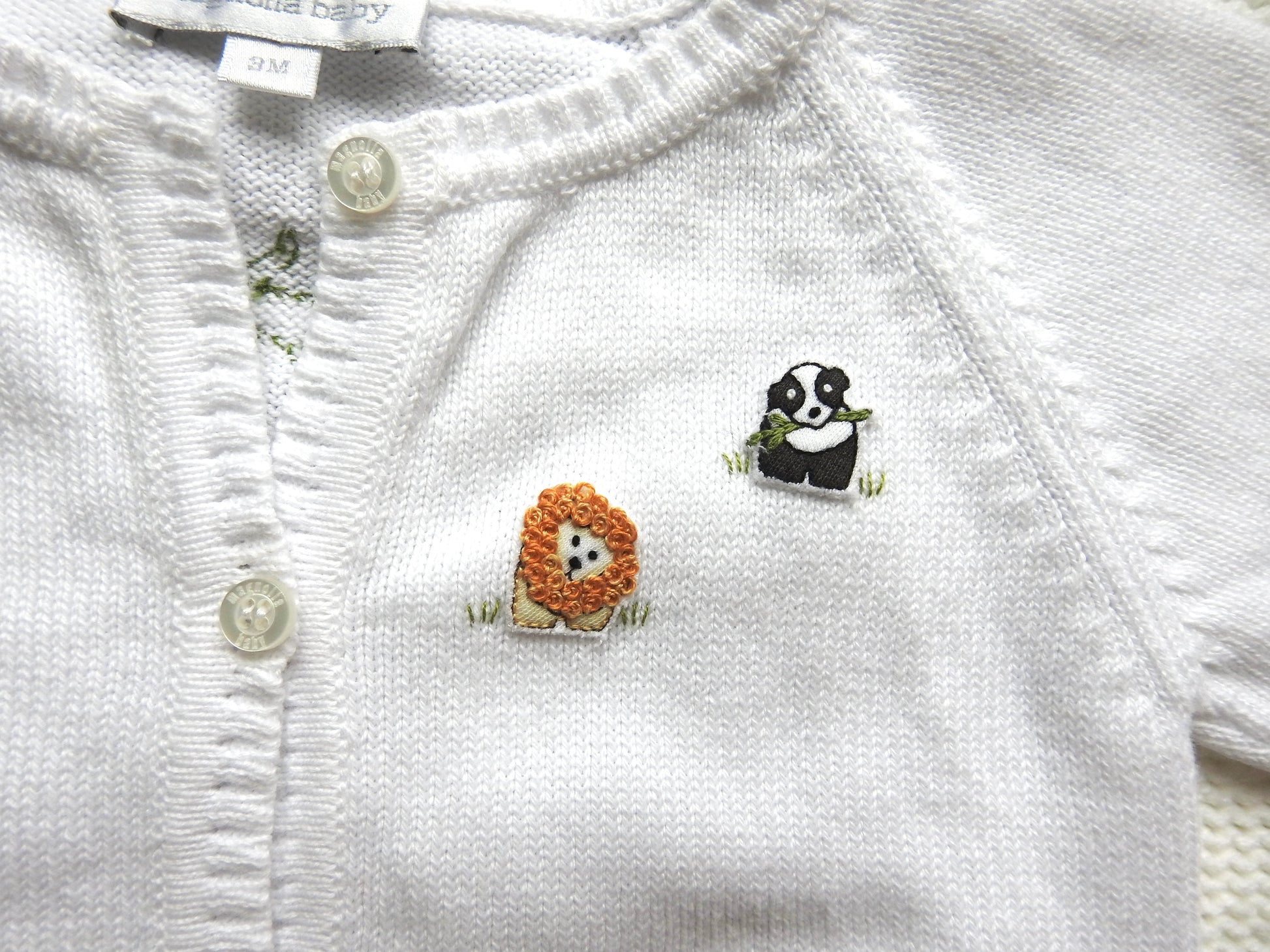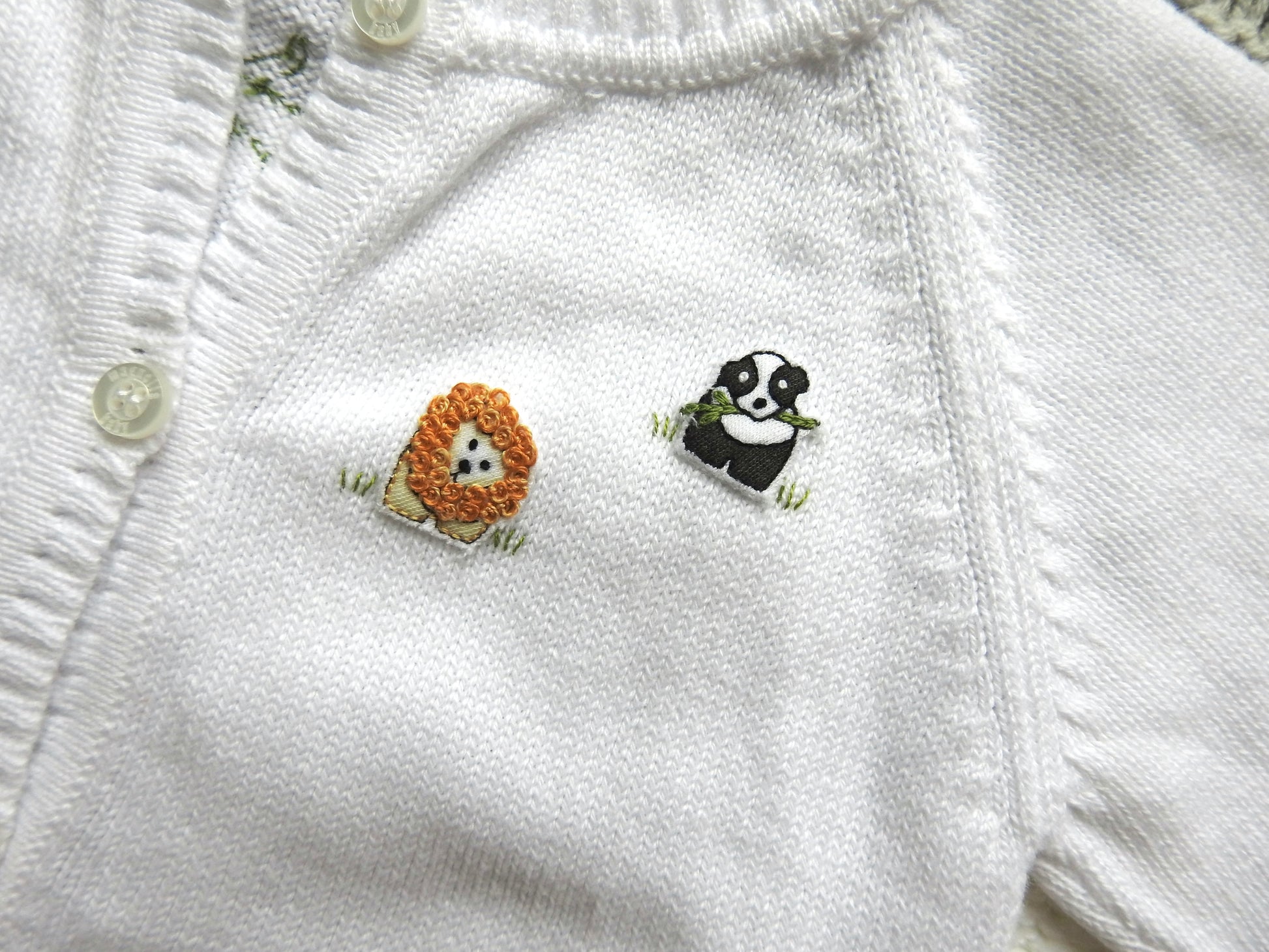 - Embroidered animals: lion, panda, crocodiles (front and back), hippos (sleeves)