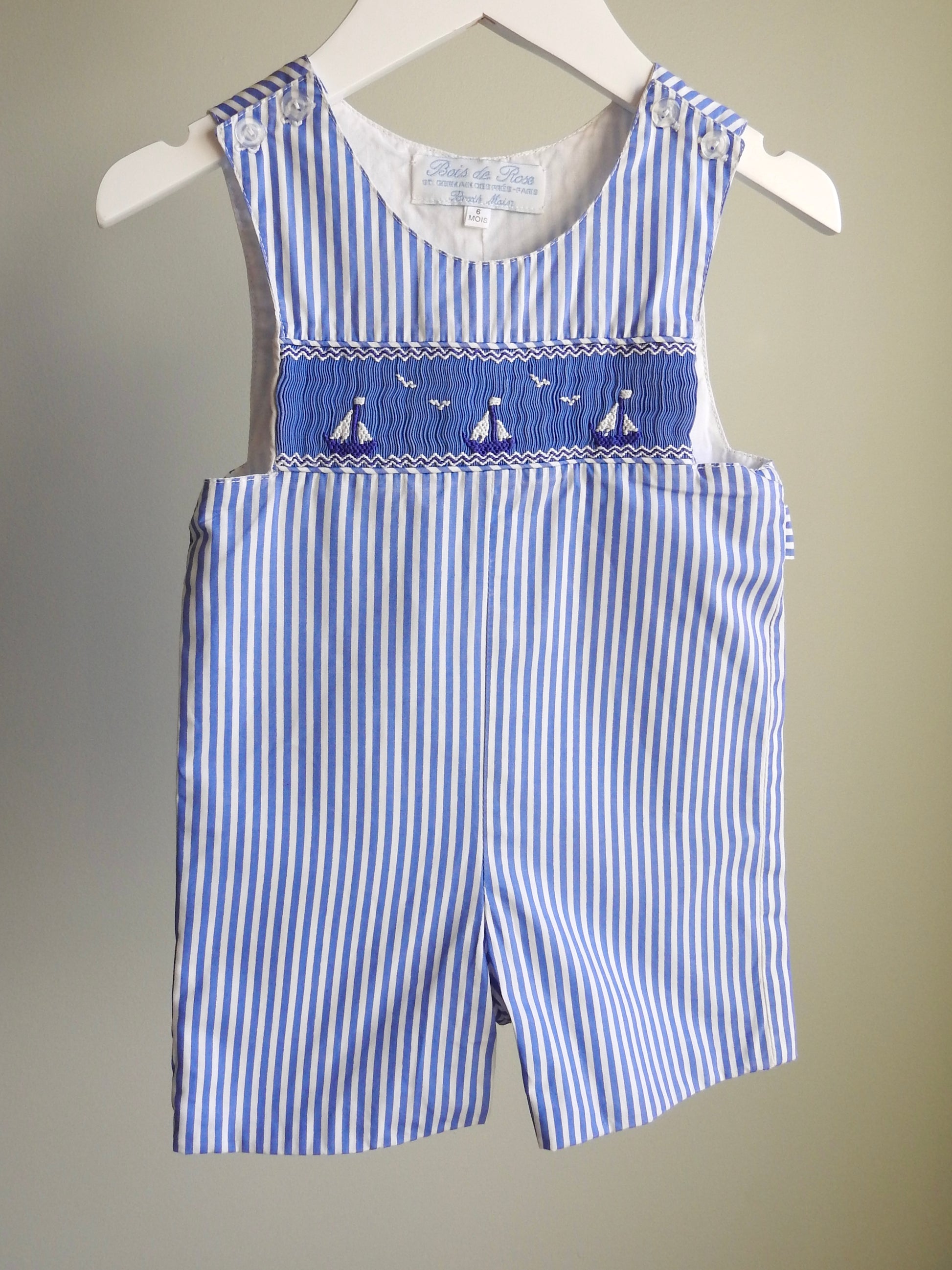 - Hand-smocked chest panel with sailboat embroidery and seagull accents